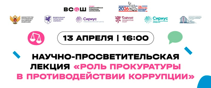 Сегодня, 13 апреля, в 16:00 в Сириусе в рамках заключительного этапа всероссийской олимпиады школьников по праву пройдёт научно-просветительское мероприятие «Роль прокуратуры в противодействии коррупции».